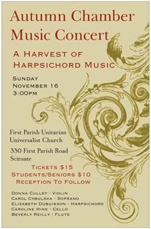 This program showcased a rich and varied group of talented performers that have graciously assisted our cause: Jazz pianist Eyran Katsenelenbogen; singer-songwriter Dawna Hammers; classical pianist Dr. Kenneth Wolf; featured works by Duxbury composer Larence Smith; violinist Donna Culley; soprano Carol Cybulska; cellist Caroline Hine; harpsichordist David Dubuisson, floutist Beverly Reilly. The final celebratory concert in November 2016 had organists Berni Nadeau, Mark Slawson, and our own Beth Dubuisson pulling out all the stops!