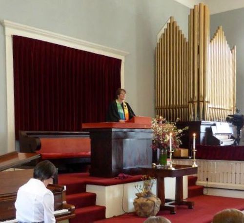 The only items saved were the heavy mahogony pulpit, the settee, and the communion table that are used in the church today. Chunks of metal from the Paul Revere bell that melted in the fire were made into miniature bells which were sold to raise funds for the present ediface.